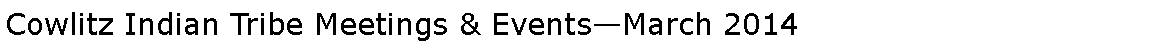 1 Culture Board 7 a.m. Longview Tribal Council 9 a.m. Longview Medicine Wheel Teachings 12:45 p.m. Castle Rock Grange Health Board After Tribal Council Longview |